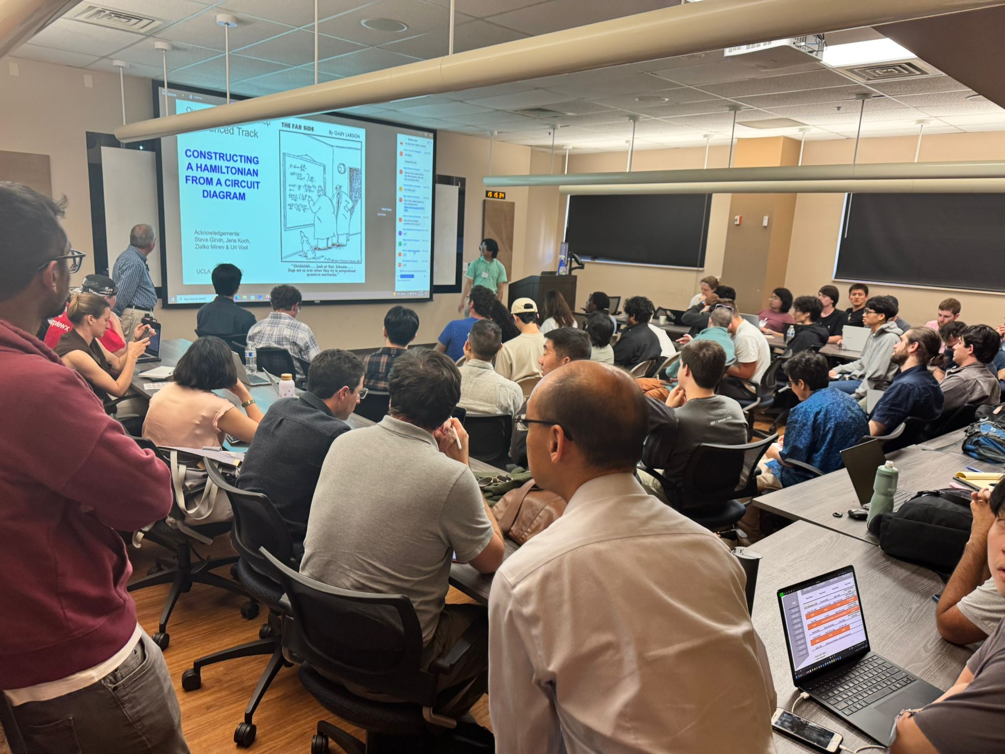 Quantum Device Workshop Organizer Cody Fan helps Professor Devoret do a quick A/V check before his advanced track talk.